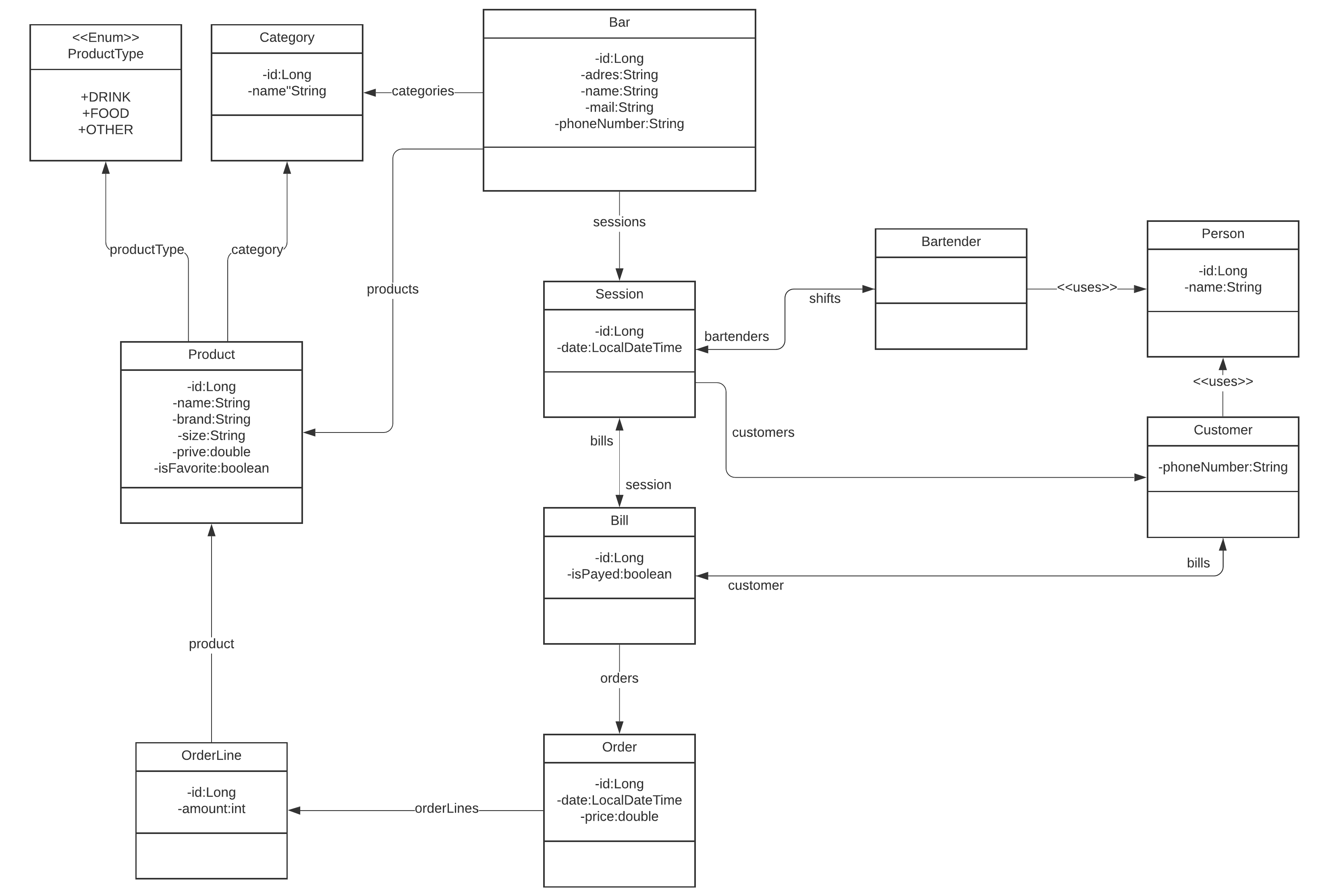 We modelled the concept into a domain model to plan out the structure of the system. The core domain concepts we decided on were the bar, products, session, bills (with orders), and the people. This was the very first version of our system.